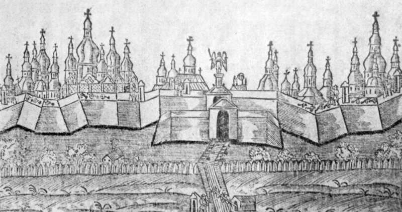 Ініціатором спорудження Печерської фортеці в Києві був Петро І. Закладена вона 1706 p., а 1724-го була завершена. Панорама споруд фортеці показана з боку Старого Києва. Перед валами і бастіонами – рів, зовні оточений палісадом. Підйомний міст через рів веде до равеліну, за яким знаходяться головні Київські ворота. Над ними – статуя архістратига Михаїла. Зліва направо розмістилися споруди: Спас на Берестові, Всіхсвятська надбрамна церква, Успенський собор лаври, трапезна чи настоятельська церква, губернаторський будинок, Феодосіївська церква з дзвіницею, надбрамна церква, трапезна та собор Вознесенського монастиря.
