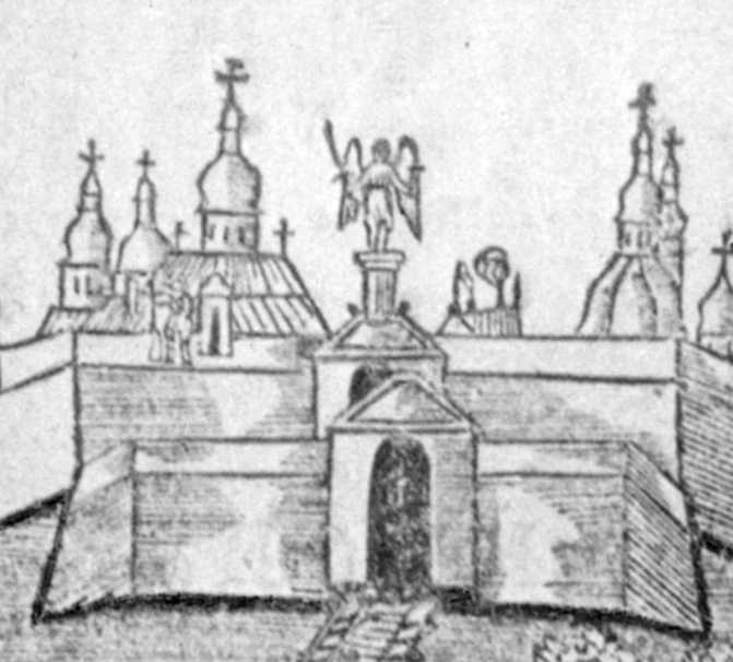 Церква св.Феодосія і брамаРозмір зображення: 671:606 піксел Джерело: Крізь віки: Київ в образотворчому мистецтві 12 – 20 ст. – К.: Мистецтво, 1982 р., № 68. |