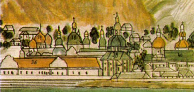 Фрагмент з Іллінської церквоюРозмір зображення: 800:381 піксел Джерело: Крізь віки: Київ в образотворчому мистецтві 12 – 20 ст. – К.: Мистецтво, 1982 р., № 80. |
