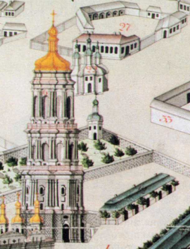 Дзвіниця, башта Кущника і церква св.ФеодосіяРозмір зображення: 610:800 піксел Джерело: Крізь віки: Київ в образотворчому мистецтві 12 – 20 ст. – К.: Мистецтво, 1982 р., № 100. |