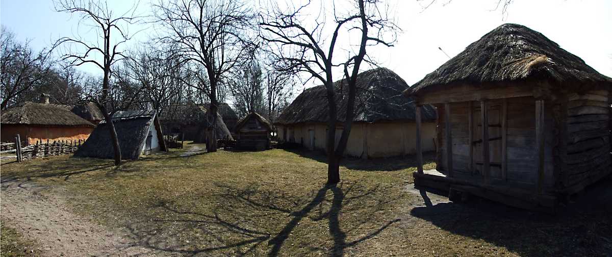 2011 р. Панорама двора Розмір зображення: 1200:504 піксел 30 березня 2011 р. Фото М.І.Жарких. Вкладені елементи Повітка садиби 2, погрібник, клуня, саж, фрагмент повітки Повітка, комора