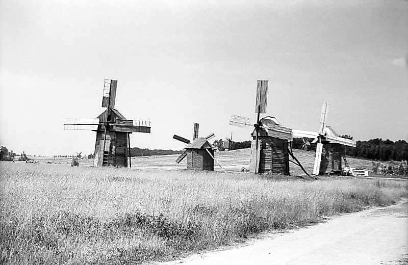 1979 р. Загальний вигляд групи вітряків зі сходуРозмір зображення: 800:520 піксел 1979 р. 14 червня. Фото М.І.Жарких. Негатека, № 100-10. |