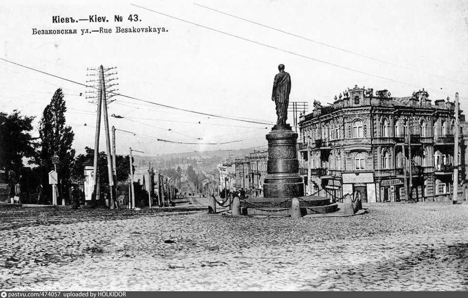 1905..1906 рр. Пам’ятник О. Бобринському на тлі вул. БезаківськоїРозмір зображення: 960:611 піксел Фото опублікував Олег Заварзін 8.12.2019 р. Вул. Безаківська – нині Петлюри. |