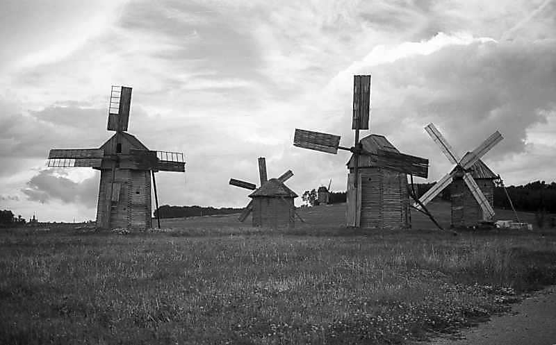 1979 р. Загальний вигляд групи вітряків зі сходуРозмір зображення: 800:497 піксел 1979 р. 7 липня. Фото М.І.Жарких. Негатека, № 103-24. |