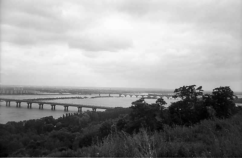 Міст Патона та південний залізничний містРозмір зображення: 800:522 піксел 1980 р. 17 серпня. Фото М.І.Жарких. Негатека, № 122-25. |