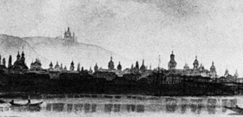 Центральна частина ПодолуРозмір зображення: 800:387 піксел Джерело: Крізь віки: Київ в образотворчому мистецтві 12 – 20 ст. – К.: Мистецтво, 1982 р., № 140. |