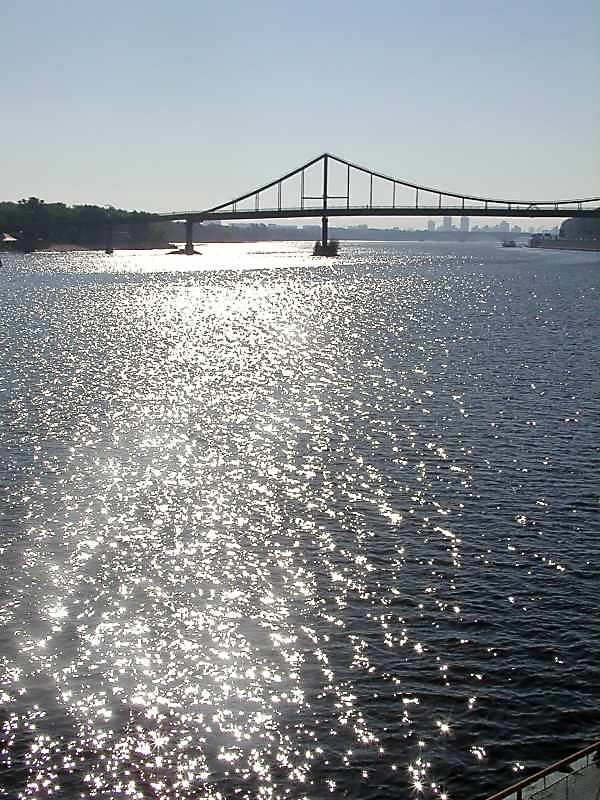 2005 р. Сонячна доріжка на Дніпрі з видом на Пішохідний містРозмір зображення: 600:800 піксел 31 серпня 2005 р. Фото М.І.Жарких. |