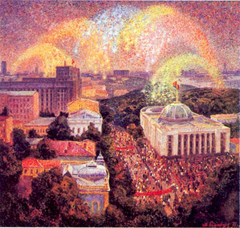 У зображенні – погляд з Печерська на Старе місто. Праворуч – будинок Верховної Ради УРСР, ліворуч – будівлі XIX ст., за ними – будинок Ради Міністрів УРСР, над яким майорить червоний прапор. На обрії – ліворуч – споруди Софійського заповідника.