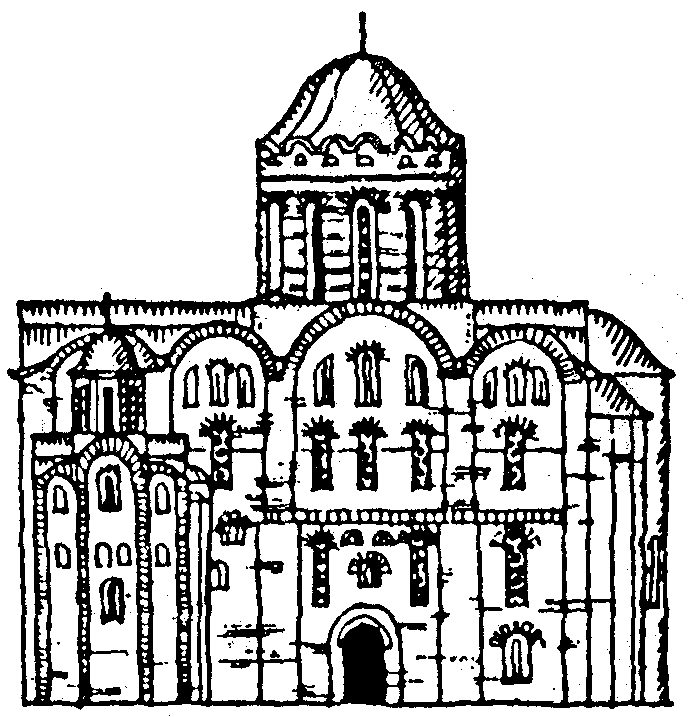 23. Михайлівський Золотоверхий собор у Димитрівському монастирі «міста Ізяслава» споруджено 1108 – 13 рр. на території Михайлівської гори – відособленого укріпленого комплексу, що виник на мисовому підвищенні над Дніпром (нині – Володимирська гірка). До наших днів храм не зберігся. Реконструкція південного фасаду собору Ю. Асєєва.