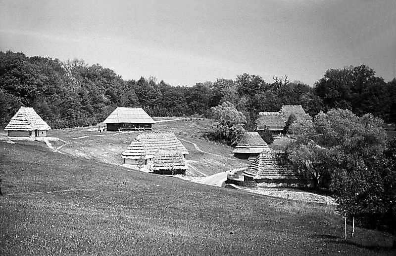 1984 р. Хата із с.Сімерки (5), хата із Синевирськоі Поляни (6), садиба із Стричави (4), млин із Пилипця (7), садина із Медведівців (3, ближче), хата із Розтоки (8, далі), хата із Рекіт (9, ще далі)