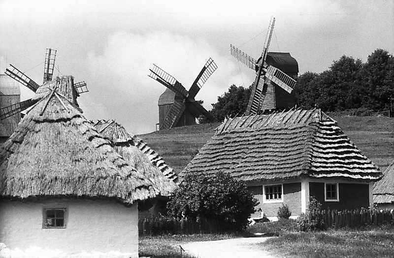 1985 р. Корчма і хата з Кадієвець на тлі гірки вітряківРозмір зображення: 800:524 піксел 1985 р. 15 червня. Фото М.І.Жарких. Негатека, № 293-07. |