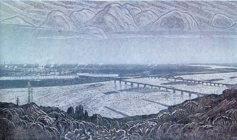 У гравюрі бачимо лівий берег Дніпра, де ростуть нові житлові масиви Русанівка і Березняки, ще далі – індустріальна Дарниця. Праворуч – мости через Дніпро: ім. Є. О. Патона і південний залізничний. Вдалині – південно-східні околиці міста, Дніпро.