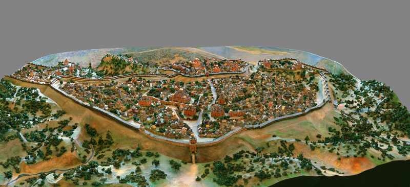 Вигляд з півдня (3)Розмір зображення: 800:366 піксел Головна вулиця міста веде від Золотих воріт повз Софійський собор до Десятинної церкви; зліва до города ярослава примикає Копирів кінець. |