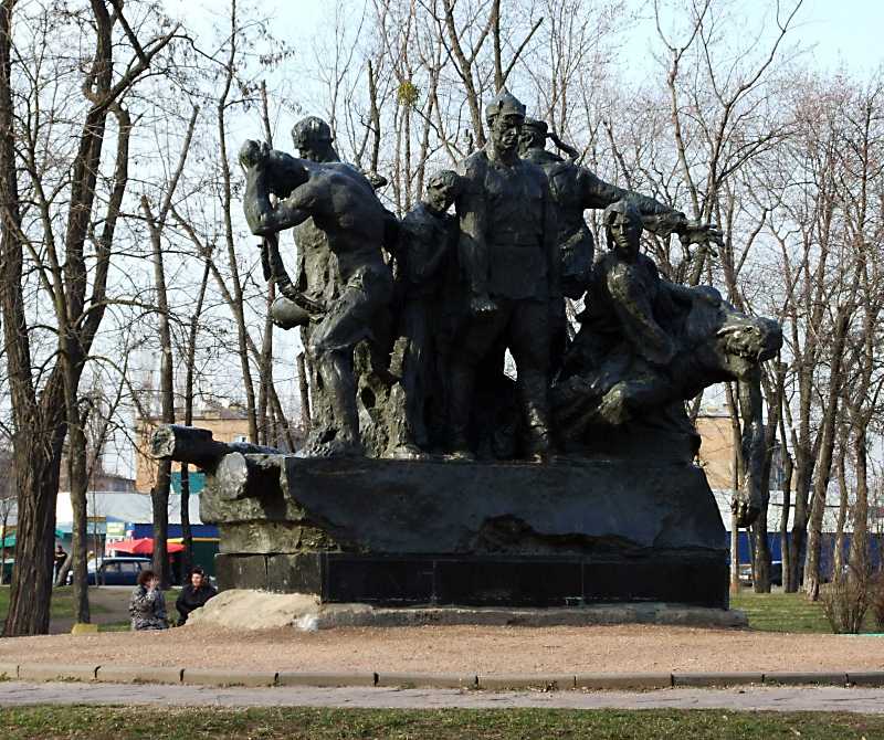 2011 р. Загальний вигляд з позиції А4 Розмір зображення: 800:670 піксел 3 квітня 2011 р. Фото М.І.Жарких. Вкладені елементи Бійці зі стволом кулемета і стрічкою Підліток та комісар Медсестра з пораненим