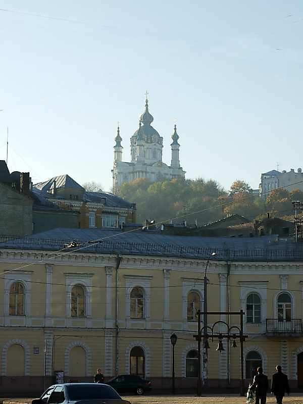 Церква на тлі будинку по Контрактовій площі, 9Розмір зображення: 600:800 піксел 18 жовтня 2007 р. Фото М.І.Жарких. |