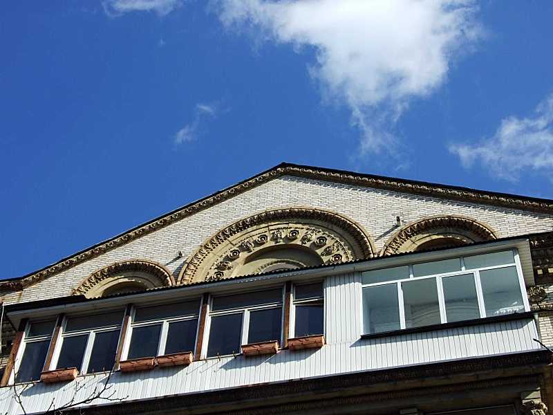 Фронтон і балкони 5-го поверху Розмір зображення: 800:600 піксел Фото М. І. Жарких, 12 березня 2020 р. Вкладені елементи Центральна арка фронтону