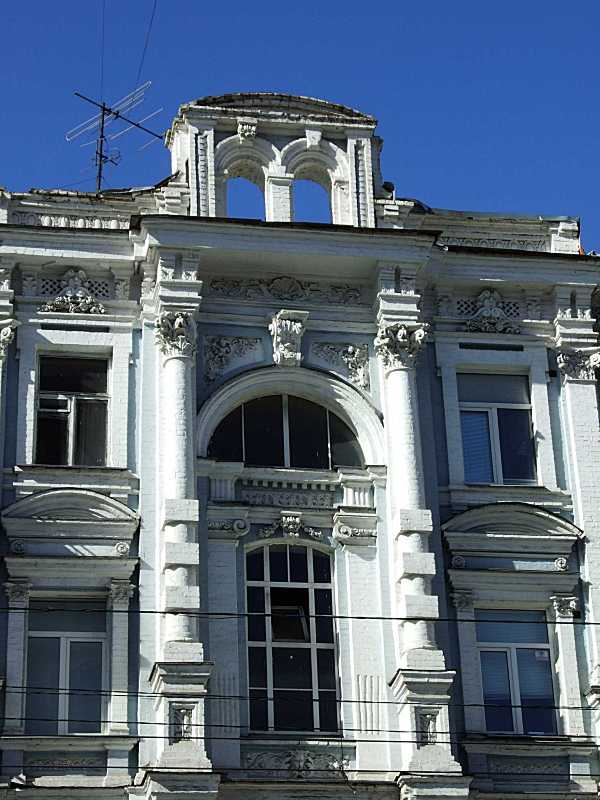 Фрагмент 3-4-го поверхів сходової клітки Розмір зображення: 600:800 піксел Фото М. І. Жарких, 13 березня 2020 р. Вкладені елементи Центральний фронтон