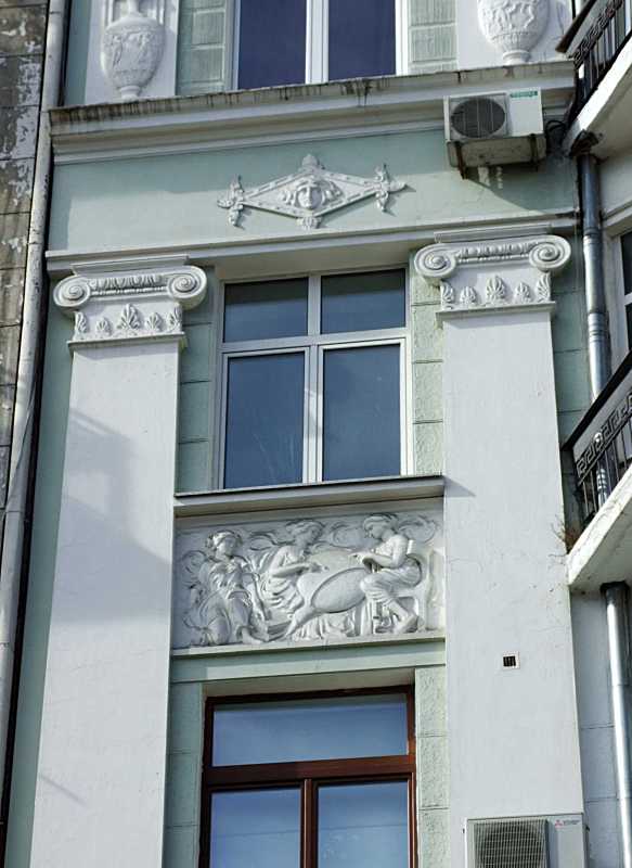 Вікно 5-го поверху Розмір зображення: 583:800 піксел Фото М. І. Жарких, 13 березня 2020 р. Вкладені елементи Капітель пілястри Ліва рельєфна вставка 5-го поверху (Наука?)