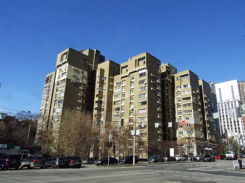 Житловий будинок (№ 94-96)Розмір зображення: 800:600 піксел Ліворуч – вул. Лабораторна (краійній від лівого боку об’єм має адресу Лвбораторна 26а), праворуч – віл. Антоновича. Фото М. І. Жарких, 13 березня 2020 р. |