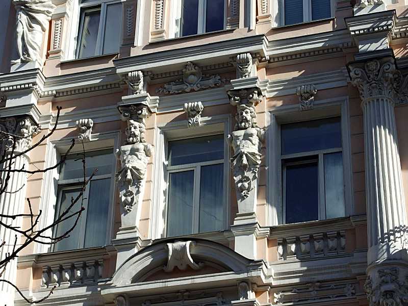 Вікна 4-го поверху Розмір зображення: 800:600 піксел Фото М. І. Жарких, 12 березня 2020 р. Вкладені елементи Скульптурне оздоблення пілястри Капітель лівої колони