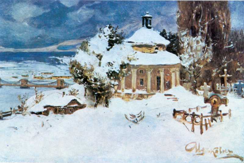 Папір, олія. Місцезнаходження оригіналу невідоме. Кольорова репродукція в альбомі «Київ», видавництво «День», 1913.