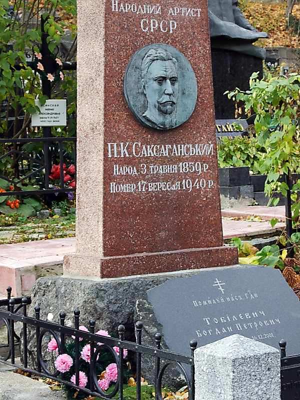 Могила П.К.Саксаганського – актора і режисера, народного артиста СРСР, пам’ятник, скульптори А.Білостоцький [Памятники истории и культуры Украинской ССР. – К.: 1987 г., с. 19].