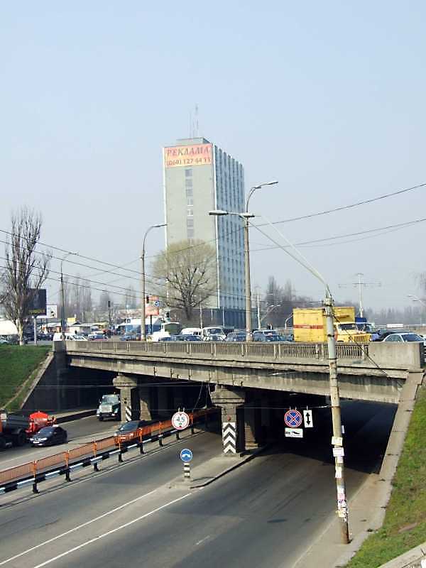 2009 р. Шляхопровід вул. Дегтерівської над просп.ПеремогиРозмір зображення: 600:800 піксел На тлі висотного будинку № 57. Вигляд зі сходу. 17 квітня 2009 р. Фото М.І.Жарких. |