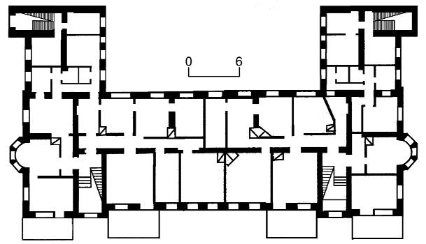 [2003 р.] План першого поверху житлових будинків № 4 і 5Розмір зображення: 609:350 піксел Джерело: Звід пам’яток історії і культури України. – К.: 2003 р., т. 2 (Київ), № 443-05a. |