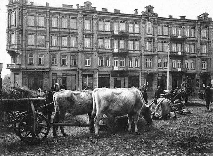 Поч. 20 ст. Воловий віз на Бесарабській площіРозмір зображення: 709:520 піксел Фото опублікував Олег Заварзін 11.10.2019 р. Схоже, це будинок на південному боці площі, знесений заради побудови сучасного Арена-сіті. |