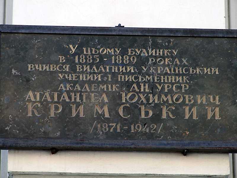 В 1885 – 1889 рр. в цьому будинку учився А.Ю.Кримський, меморіальна дошка 1971 р. [Памятники истории и культуры Украинской ССР. – К.: 1987 г., с. 30].