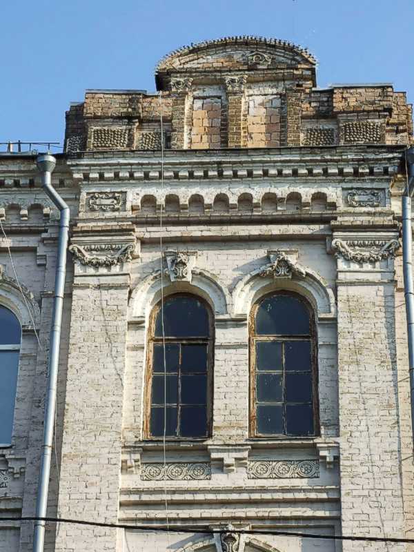 Вікна 4-го поверху і фронтон Розмір зображення: 600:800 піксел Фото М. І. Жарких, 27 березня 2021 р. Вкладені елементи Рельєфна вставка під вікном 4-го поверху