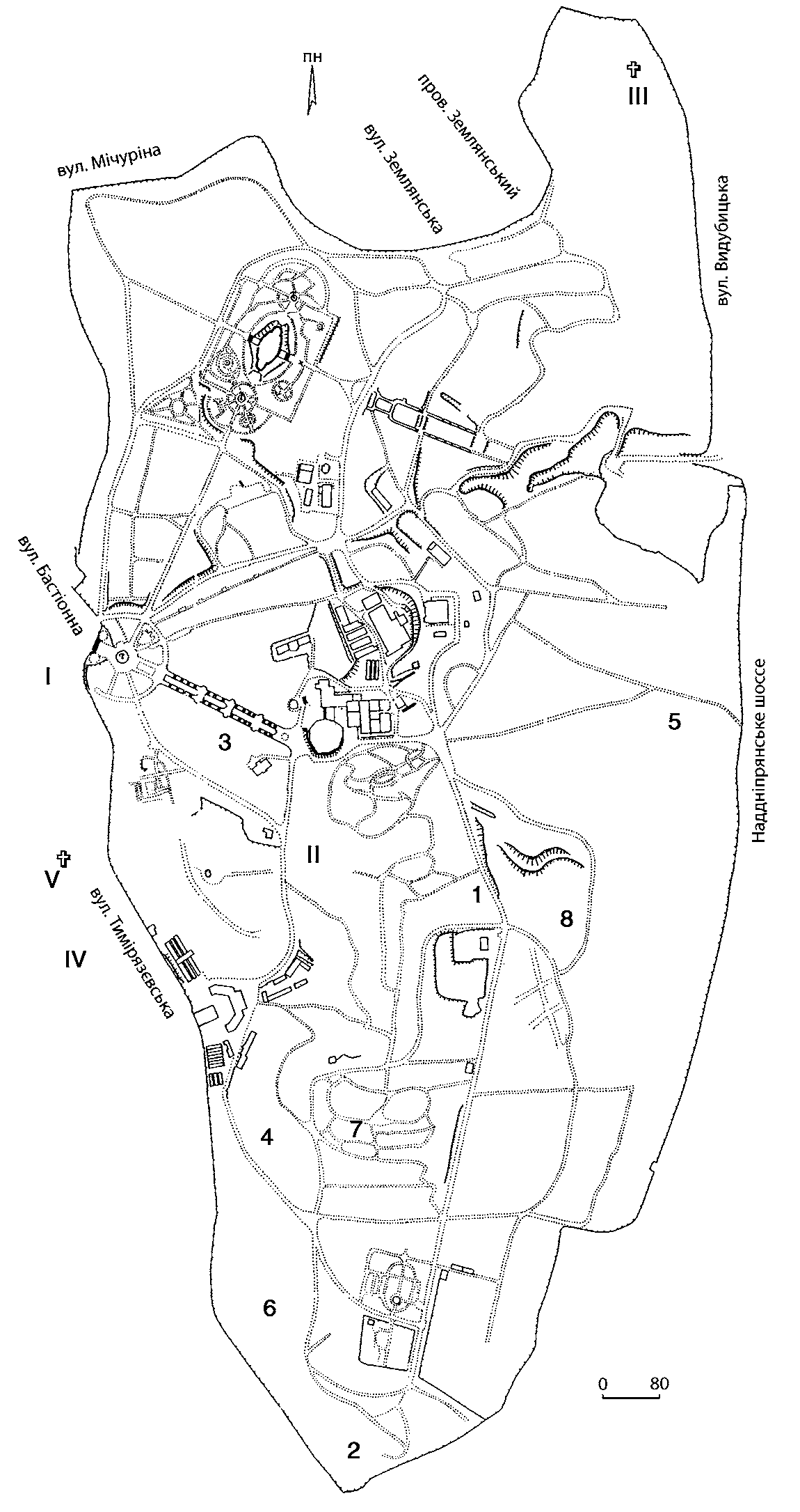 Регулярне планування головної вхідної площі та трасування радіальних алей вдало доповнене мальовничими абрисами інших доріг, алей та стежок, прокладених згідно з особливостями рельєфу. Враховуючи те, що на території ботанічного саду містяться ансамблі Свято-Троїцького (Іонівського) та Видубицького Свято-Михайлівського монастирів, в період цвітіння бузку його відвідує 200 – 250 тис. чол. на день, 1975 в інституті «Дніпромісто» розробили проект реконструкції саду (автори – О. Міщук, О. Родичкіна, Н. Сидорова, П. Фещенко). Ним було передбачено нове функціональне зонування: чітко виділені експозиційно-прогулянкова та заповідна території.