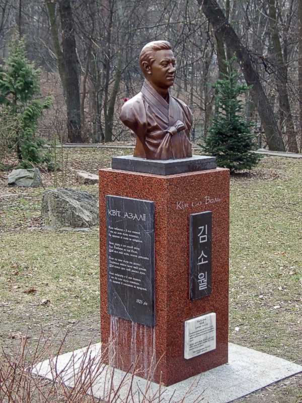 2021 р. Загальний вигляд з позиції А4 Розмір зображення: 600:800 піксел Фото М. І. Жарких, 29 березня 2021 р. Вкладені елементи Бюст Кім Со Воля Таблця в поезією «Квіт азалії»