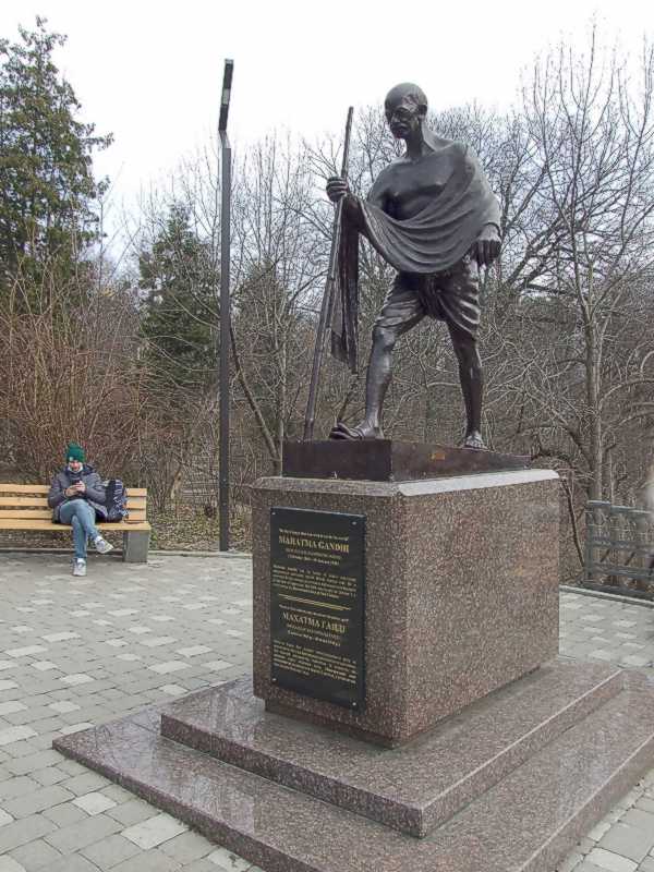 Пам’ятник Махатмі Ганді Розмір зображення: 600:800 піксел Фото М. І. Жарких, 29 березня 2021 р. Вкладені елементи 2021 р. Загальний вигляд з позиції С2 2021 р. Постать М. Ганді у 3/4 2021 р. Загальний вигляд з позиції С3 (+) 2021 р. Загальний вигляд з позиції А4 (+)