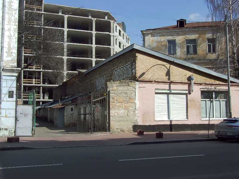 Ліворуч – маленький кусочок будинку № 4, за ним – недобудований житловий комплекс «Андріївський», який теж нібито має адресу Братська, 4, хоча фасадом виходить на Андріївську. В центрі – кузня, за нею направо йде зерносховище (Братська, 2). Фото М. І. Жарких, 21 березня 2021 р.