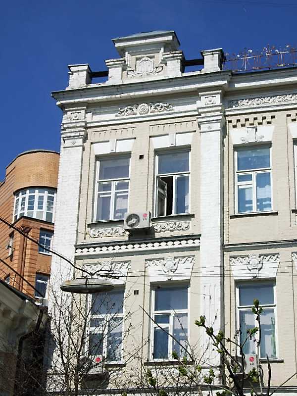 Фрагмент 3-4-го поверхів Розмір зображення: 600:800 піксел 9 квітня 2009 р. Фото М.І.Жарких. Вкладені елементи Фронтон з датою 1907 о.