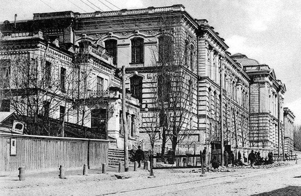 1898..1909 рр. Загальний вигляд до надбудовиРозмір зображення: 960:626 піксел Фото опублікував Олег Заварзін 11.10.2019 р. Ліворуч – Народна аудиторія (№ 26), ще до перебудови 1909 р. Звідси й дата фото. |