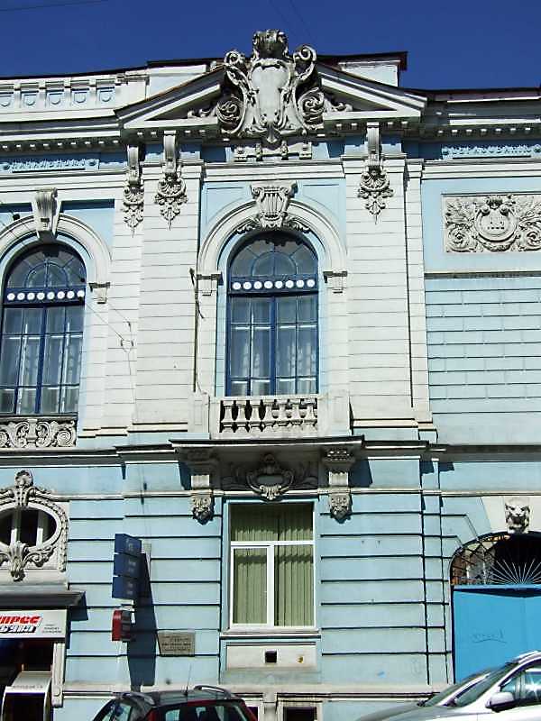 2009 р. Фрагмент головного фасаду Розмір зображення: 600:800 піксел 9 квітня 2009 р. Фото М.І.Жарких. Вкладені елементи Фронтон (+) Сандрик і балкон Меморіальна дошка зборів РСДРП(б) 19.03.1917 р. Вікно 1-го поверху