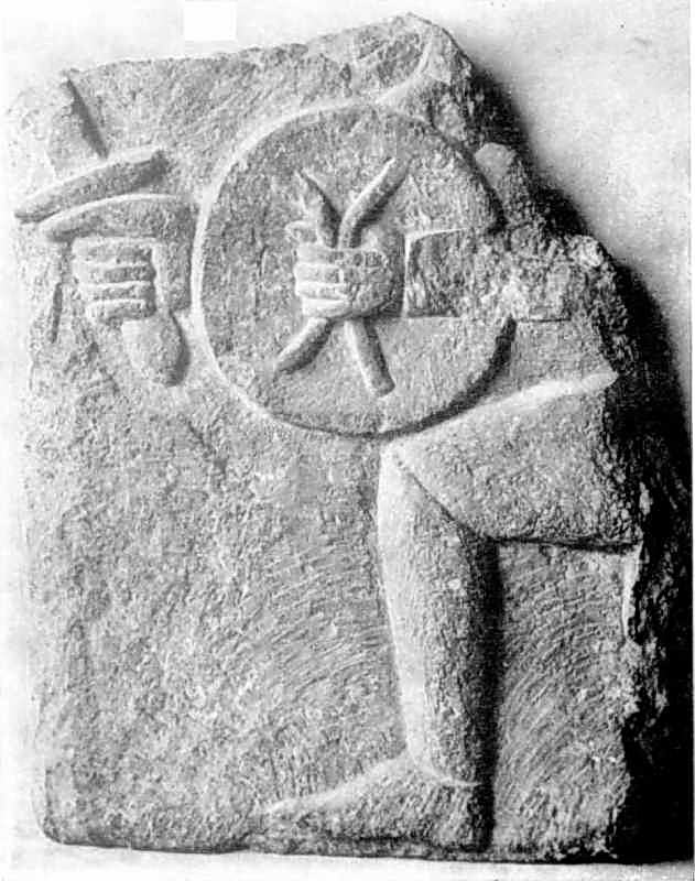 Фрагмент шиферного рельєфу з зображенням воїна з Ірининської церкви в Києві. XI ст. Державний історичний музей УРСР.
