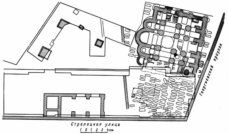 Фундаментні рови з залишками дерев’яних субструкцій церкви (за М.К.Каргером)