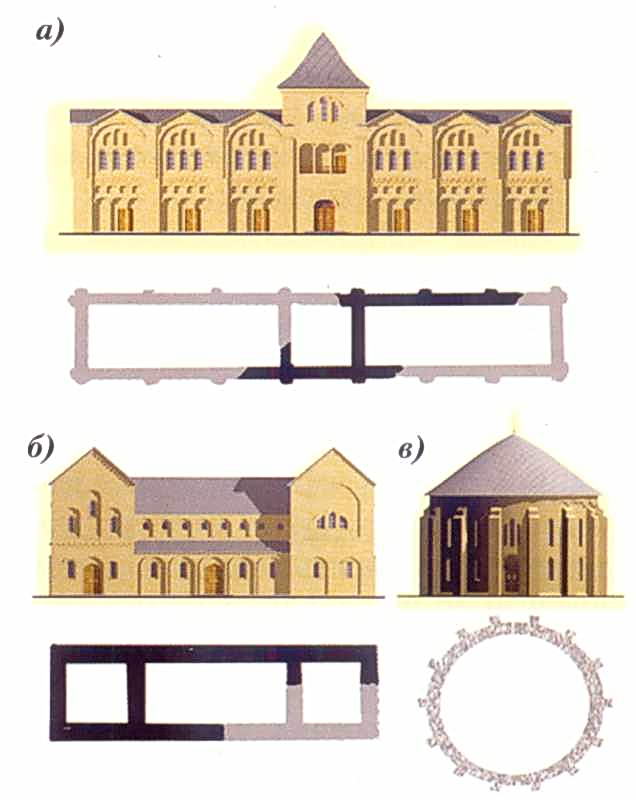 Князівські палацові будівлі Київського дитинця. Плани, рекомпозиції фасадів Х-ХІ ст.: а) Західний палац (Володимира); б) Південний палац (Ярополка); в) Палац княгині Ольги (за проектом Ю. Асеева, 1981 р.)