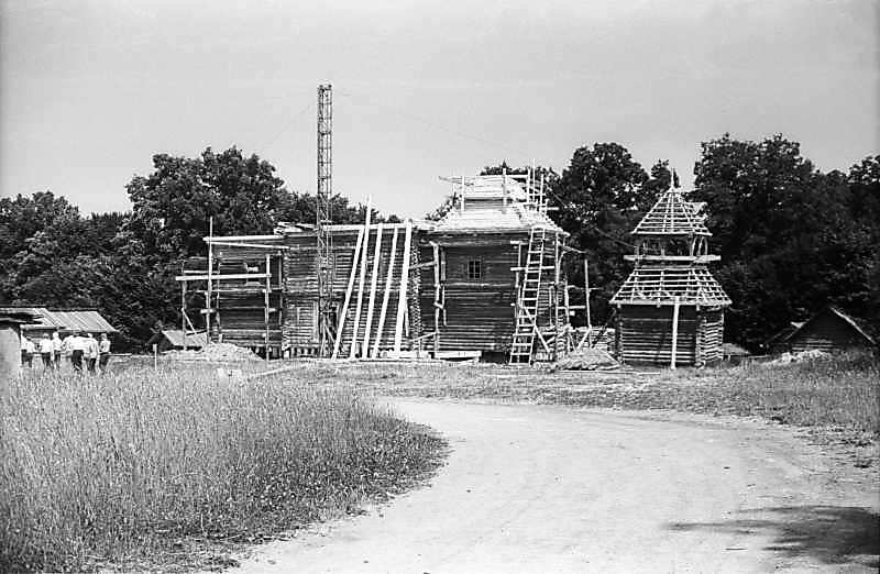1979 р. Загальний вигляд з півдня в процесі монтажа у Київському музеї народної архітектуриРозмір зображення: 800:522 піксел 1979 р. 14 червня. Фото М.І.Жарких. Негатека, № 100-08. |