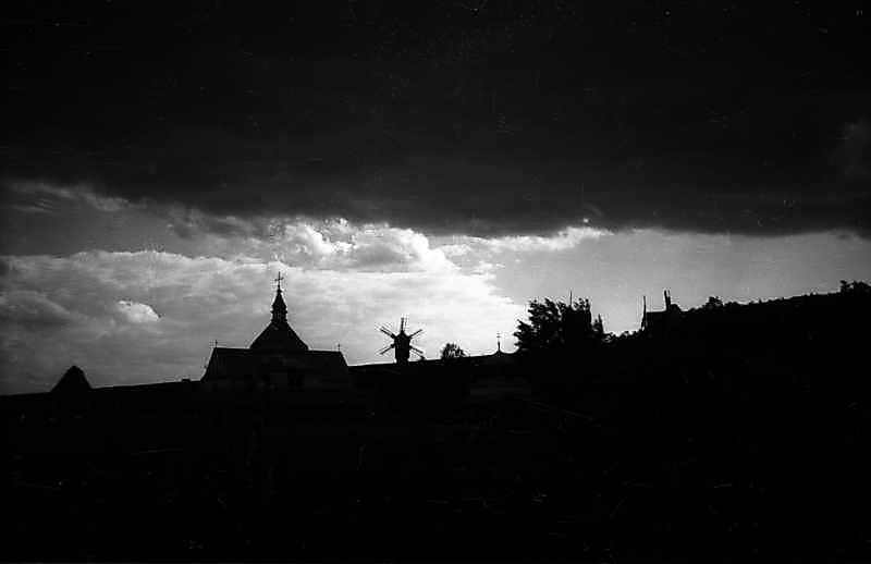 1977 р. Силует на тлі гірки вітряківРозмір зображення: 800:518 піксел 1977 р. 25 травня. Фото М.І.Жарких. Негатека, № A268-36. |