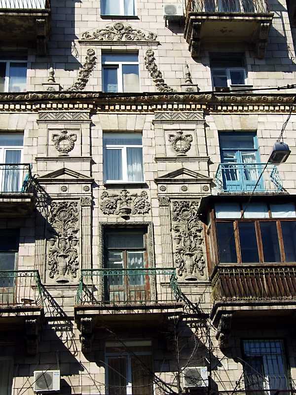 Фрагмент фасаду Розмір зображення: 600:800 піксел 3 квітня 2009 р. Фото М.І.Жарких. Вкладені елементи Лиштва-фронтон Керамічна рельєфна вставка Керамічна рельєфна вставка