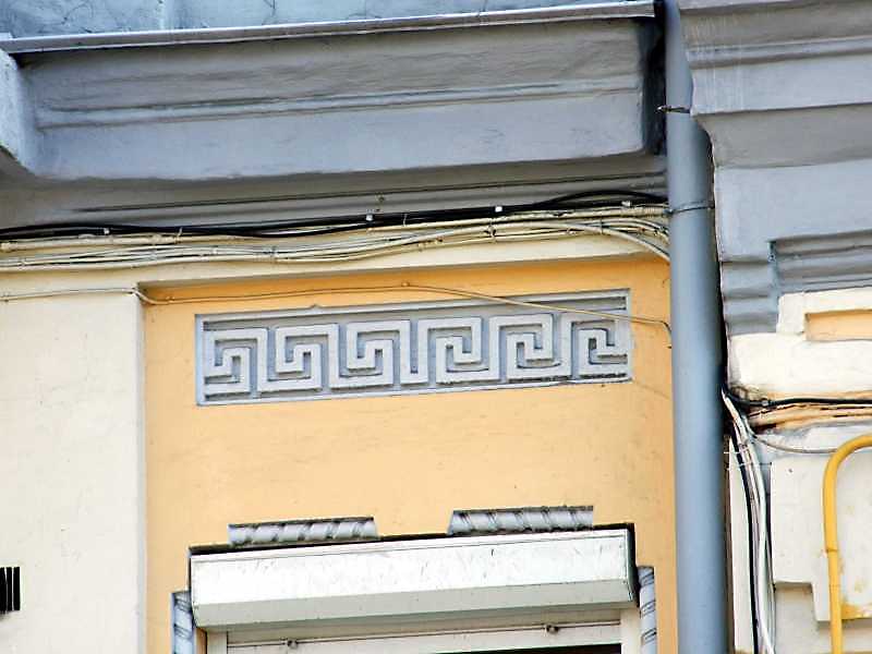 Стрічка меандра над вікном 1-го поверху Розмір зображення: 800:600 піксел 3 квітня 2009 р. Фото М.І.Жарких. Попередня сторінка | Вище | Наступна сторінка