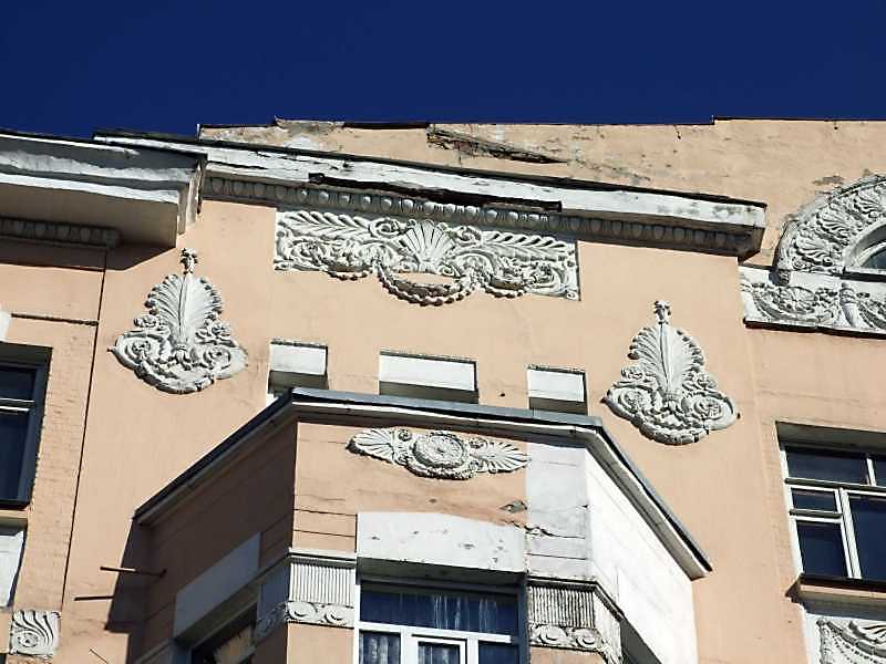 Фрагмент фасаду Розмір зображення: 800:600 піксел 21 квітня 2009 р. Фото М.І.Жарких. Вкладені елементи Рельєфна вставка у фронтоні