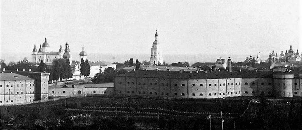 На передньому плані – казарма, далі Миколаївська брама і корпус арсеналу. Далі – Пустинно-Микільський монастир, праворуч – Верхня лавра. На собор Микільського монастиря накладається верх церкви Миколи Слупського.