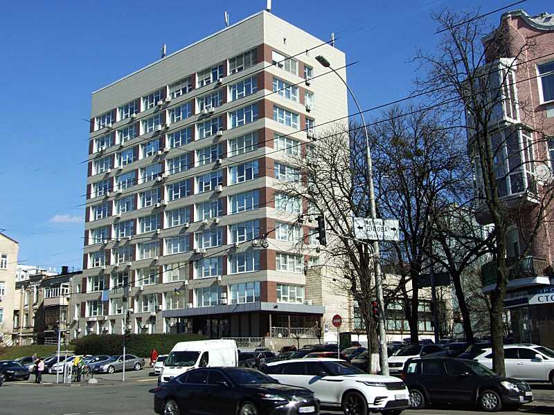 Адміністративний будинок (№ 24)Розмір зображення: 800:600 піксел Ліворуч – вул. Антоновича, праворуч – вул. Ділова. Фото М. І. Жарких, 12 березня 2020 р. |