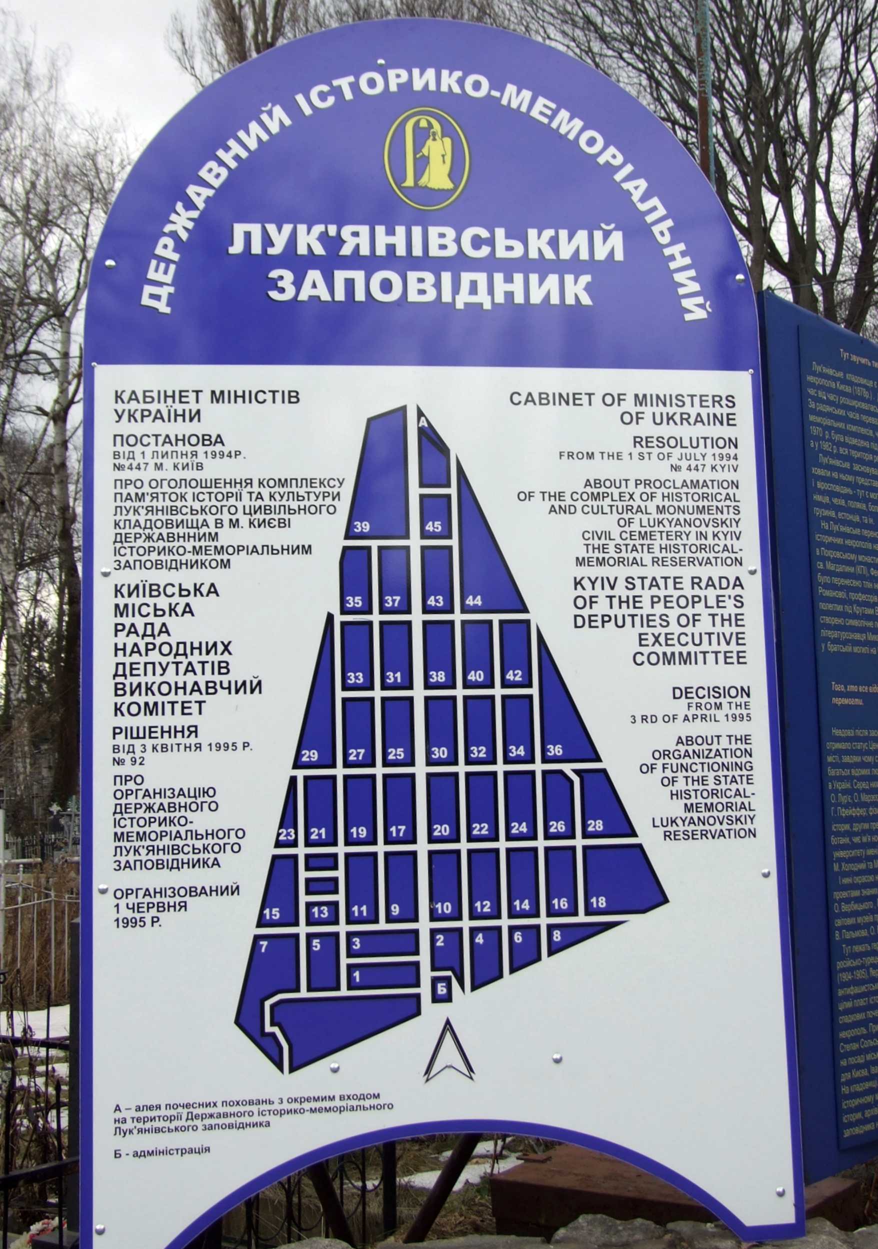 Схема полів цвинтаряРозмір зображення: 1756:2498 піксел На плані південь – вгорі, північ (де вул. Дорогожицька) – внизу. Зображення – 6 Мпікс, все можна прочитати. Фото М. І. Жарких, 18 березня 2021 р. |