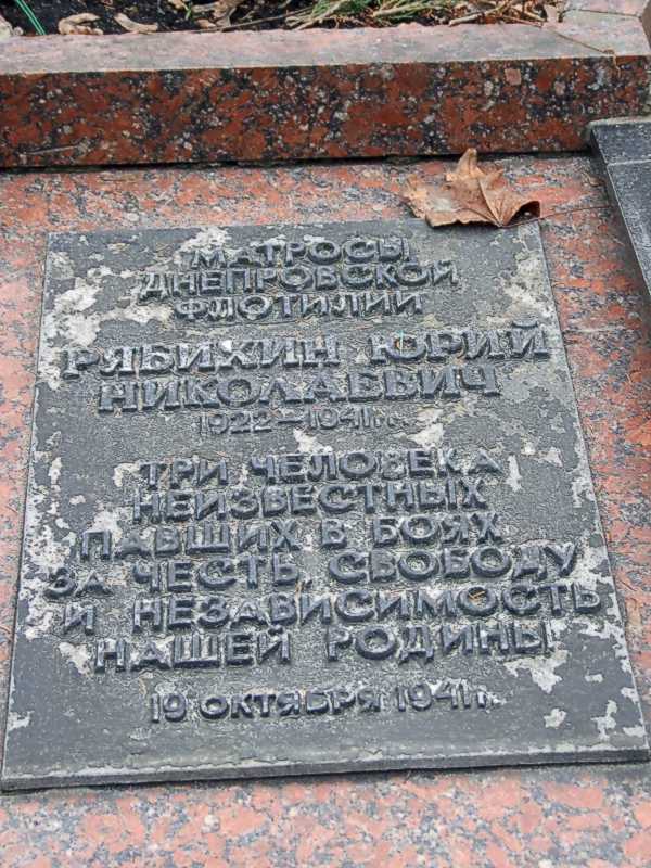 Напис: «Матросы Днепровской флотилии Рябихин Юрий Николаевич 1922 – 1941 гг. Три человека неизвестных павших в в боях за честь, свободу и независимость нашей родины 19 октября 1941 г.»